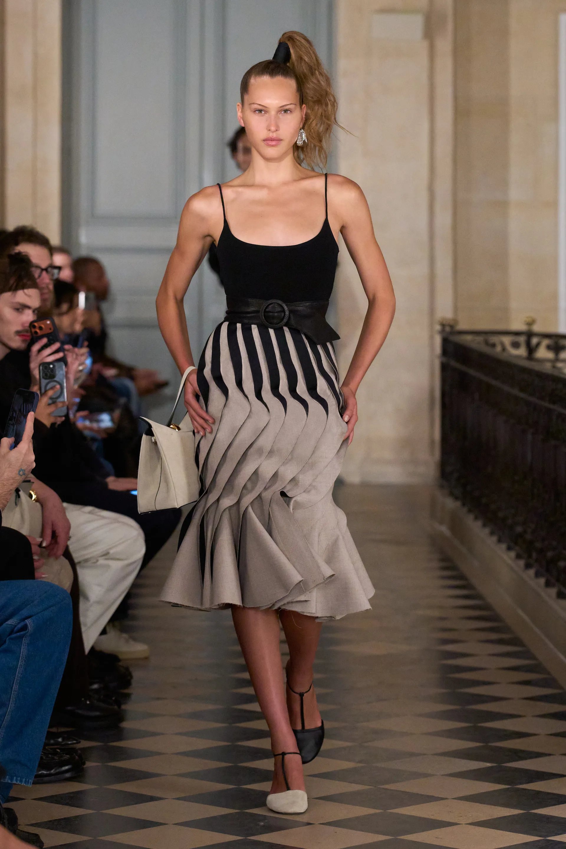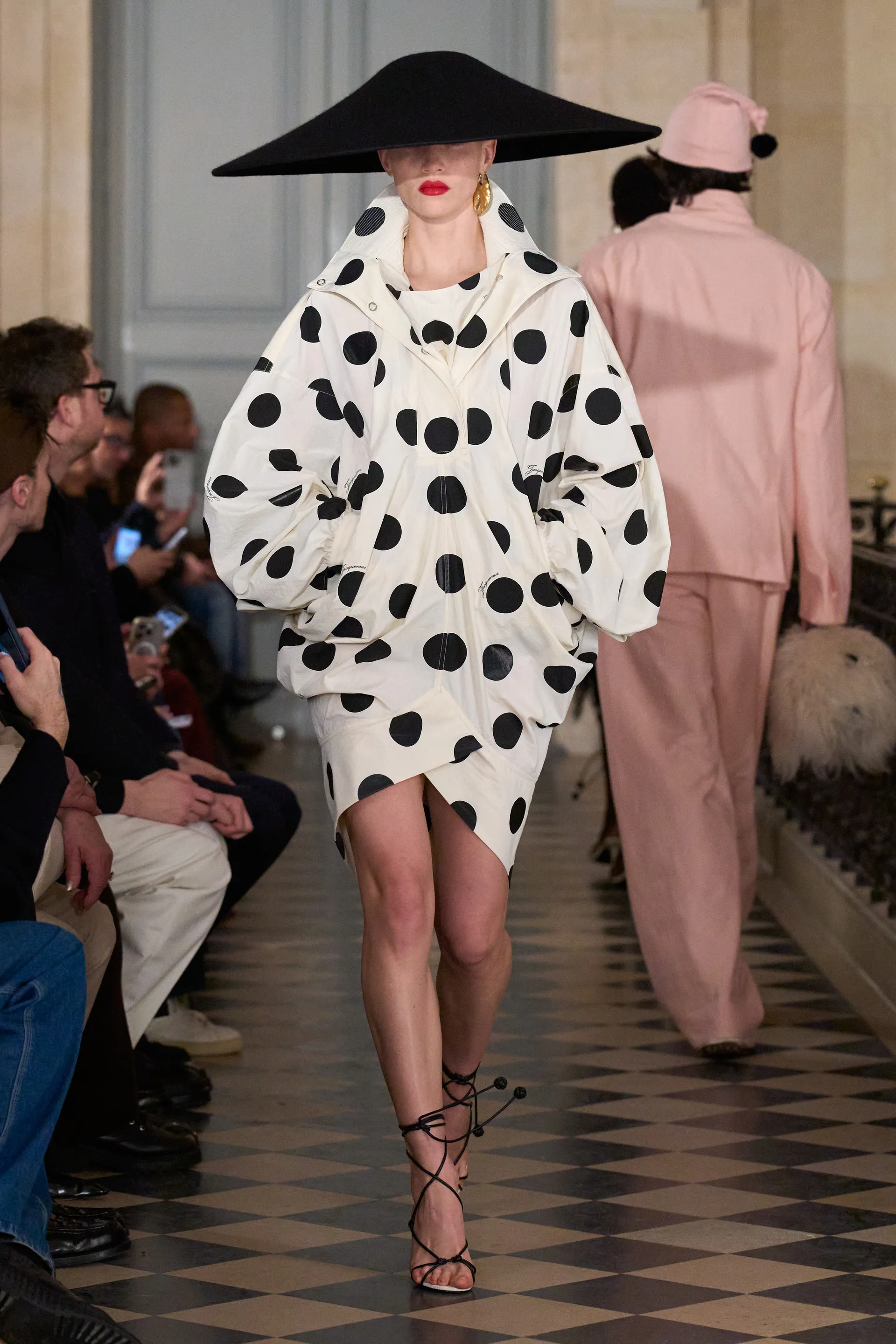 El desfile fue acompañado por una serie de cortometrajes dirigidos por Valérie Donzelli, que aportaron un tono de "comedia coral" y humor burlesco a la velada. Hombros y siluetas creando una figura de "mujer espectáculo" que domina la escena, y accesorios con carácter; bolsos con formas geométricas audaces y calzado que parece sacado de un set de rodaje de los años 80, reinterpretando los clásicos de la casa con un giro más satírico. Este espacio, clave en los inicios de la marca, volvió a ser el hogar de la firma, creando un contraste perfecto entre la arquitectura del siglo XVII y la modernidad de la colección.