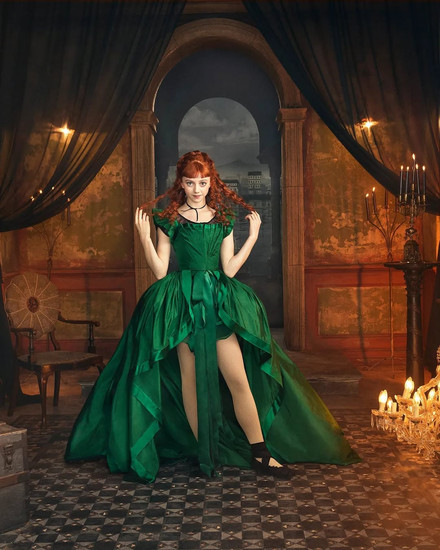 Pero no todo es sobriedad: los nuevos personajes y figuras femeninas lucen vestidos de ensueño que parecen salidos de un cuadro barroco. Desde el verde esmeralda intenso hasta tonos marfil y dorados, los looks juegan con texturas voluminosas, corsets ceñidos y faldas de gran caída que evocan a la corte francesa del siglo XVIII.